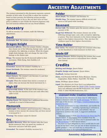 The Draw Steel core rules introduce a number of retainers — mostly aligned with a specific ancestral or species faction. This document expands those options by introducing 26 new class retainers representing every subclass in the core rules and presenting a modular ancestry system that allows you to create a retainer for any ancestry–class combination in the core rules. Optional rules include advice for giving treasures to retainers and applying weapon kits.